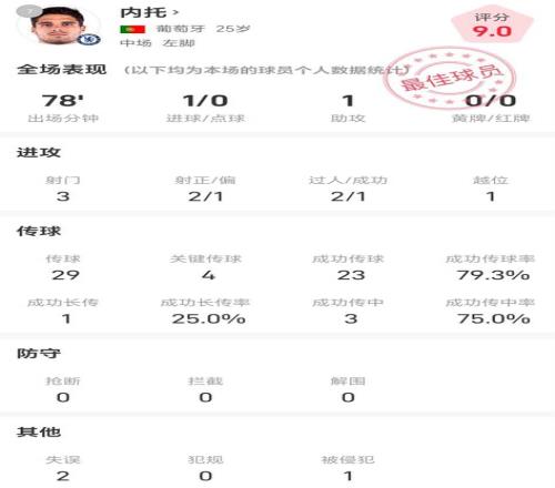 雷速体育10月18日宣 英超第8轮,切尔西对阵诺丁汉森林,此役,内托首发出场,他全场数据如下: