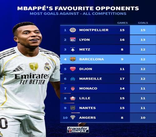 北京时间10月27日,德国转会市场盘点了姆巴佩职业生涯中进球最多的球队。其中,蒙彼利埃是他最擅长的对手,15次交手打入15球,高居榜首。巴塞罗那则位列第四,姆巴佩在9次对阵中攻入了12球。