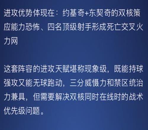 对于约基奇与东契奇的双核组合,AI明确点出了持球核心同时在场时的战术兼容性问题,提出需要「解决核心同时在线时的战术优先级问题」,以避免核心球员相互制约;同时建议设计更多高位策应与传切配合,充分发挥双核挡拆的破坏力。