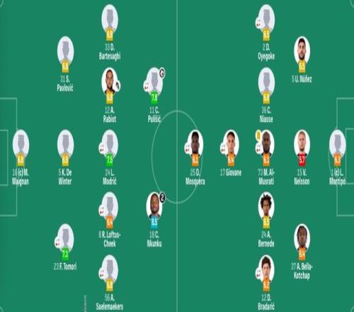 AC米兰首发:16-迈尼昂、23-托莫里(86'27-奥杜古)、31-帕夫洛维奇、5-德温特、14-莫德里奇(70'30-亚沙里)、12-拉比奥特、8-奇克(70'19-弗法纳)、56-萨勒马科尔斯(76'24-阿特卡梅)、33-巴特萨吉、18-恩昆库、11-普利希奇(76'4-里奇)