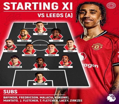 曼联首发:拉门斯/约罗、希文、利桑德罗·马丁内斯/达洛特、乌加特、卡塞米罗、卢克·肖/多尔古、库尼亚/舍什科