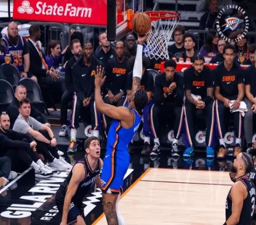 第四节决战,太阳连续拼下前场板,目前已经抢到12个前场篮板,而雷霆全队仅有1个前场篮板。古德温手起刀落三分再中,命中本场个人第7记三分,双方再次战至81-81平手。古德温相同位置三分再中,命中第8记三分,布克最后一攻完成三分绝杀,最终,雷霆105-108大爆冷不敌太阳,惨遭18分大逆转,4连胜被终结。